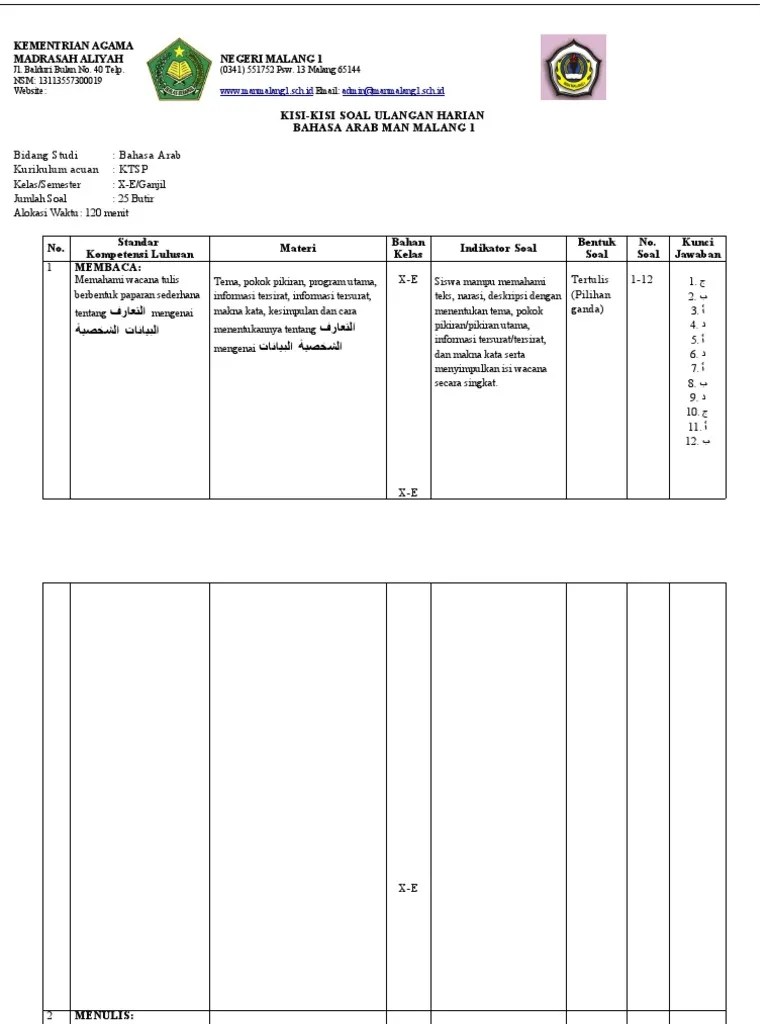 Kisi Kisi Soal Ulangan Harian Bhs Arab Kls X Ma / Kisi Kisi Soal Pat Bahasa Arab Mts Kelas 7 Tahun Pelajaran 2020 2021 Mts Arabic / Rpp bhs arab x smt 2.